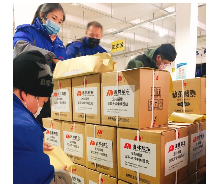 为支持政府的肺炎疫情防控工作,吉林敖东及下属子公司已先后七次向吉林省红十字会、延边州疾控防治中心、延边州内各县、市人民医院和疾控防治中心、洮南市政府等防疫部门捐赠所急需的药品和物资,包括复方板蓝根口服液、维生素C泡腾片、注射用核糖核酸Ⅱ、贞芪扶正颗粒抗病毒类、提供免疫类药品和敖东酵素、口罩12580个、护目镜575个、防护服2085个、一次性医用检查手套25000个等紧缺急需物资,在保证生产需要前提下,提供10吨乙醇供延边州防控小组统一调配使用。同时,在防控小组要求下以平价方式向市场投入医用酒精13.8万元。世航药业利用自身饮片加工优势,在国家卫健委发布新冠肺炎预防的1号方后,积极组织生产人员,加工1号方4000副,捐赠给医疗机构,助力抗疫工作。